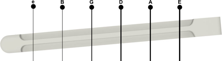 Let’s view an image of this pattern looking down on the saddle top. The saddle is at a five degree angle, which itself serves as a form of compensation. You can see where each string sits on the saddle top, but this can vary depending on bridge string spacing.