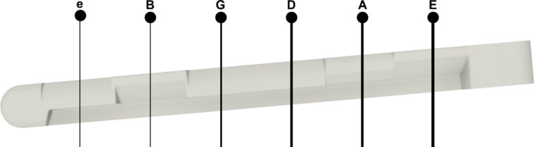 This is another aftermarket saddle pattern that we offer in bone. This pattern is similar to the center line B compensated saddle, but the A and bass E strings sit progressively farther back toward the bridge pins, as shown in the below image.